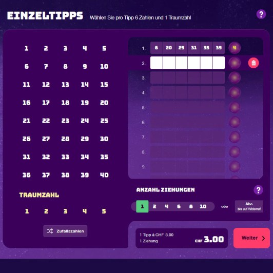 Beim Einzeltipp wählen Sie pro Tipp Ihre Zahlen und die Traumzahl selbst aus. Ein Tipp kostet 3 Franken. Sie können zwischen 1–15 Tipps auswählen.