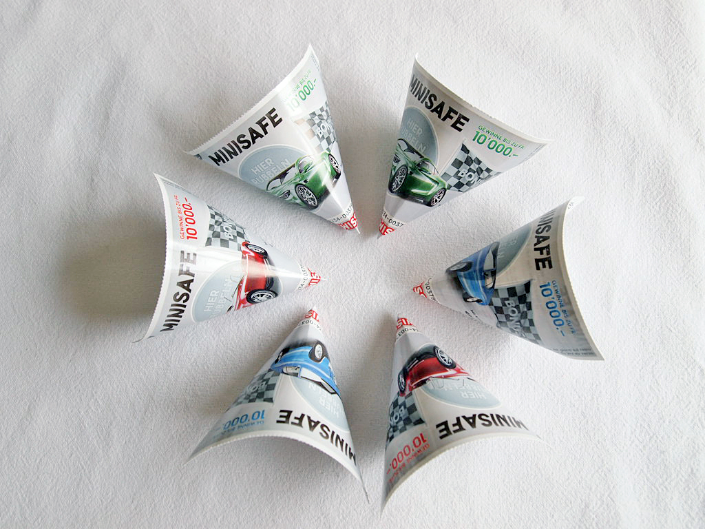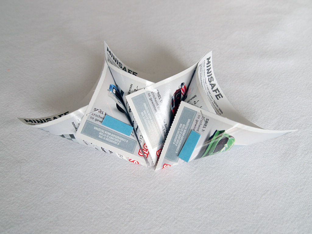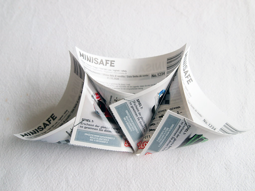 Bereiten Sie zuerst die Flügel des Schmetterlings vor. Machen Sie dazu bei den Minisafe-Losen jeweils die Mitte der langen Seiten einem Knick. Falten Sie anschliessend die Lose zu einem Trichter (Losrückseite ist innen, die Markierung zeigt, wo die Spitze des Trichters ist). Befestigen Sie die Trichter mit einem Bostitch wie auf dem Bild.