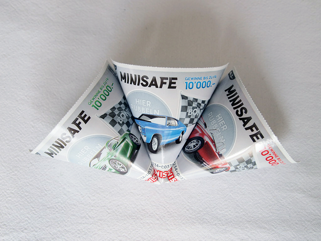 Bostitchen Sie nun jeweils drei der vorbereiteten Minisafe-Lose zu einem Flügel zusammen. Am einfachsten geht es, wenn Sie die Lose jeweils an den Ecken der langen Seite zusammen bostitchen. Achten Sie darauf, dass einerseits keine Rubbelfläche beschädigt wird und anderseits, dass bei allen Losen die überlappenden Enden auf derselben Seite sind. Anschliessend können Sie auch hier noch zwei Doppelklebe-Punkte auf der «Rückseite» befestigen.