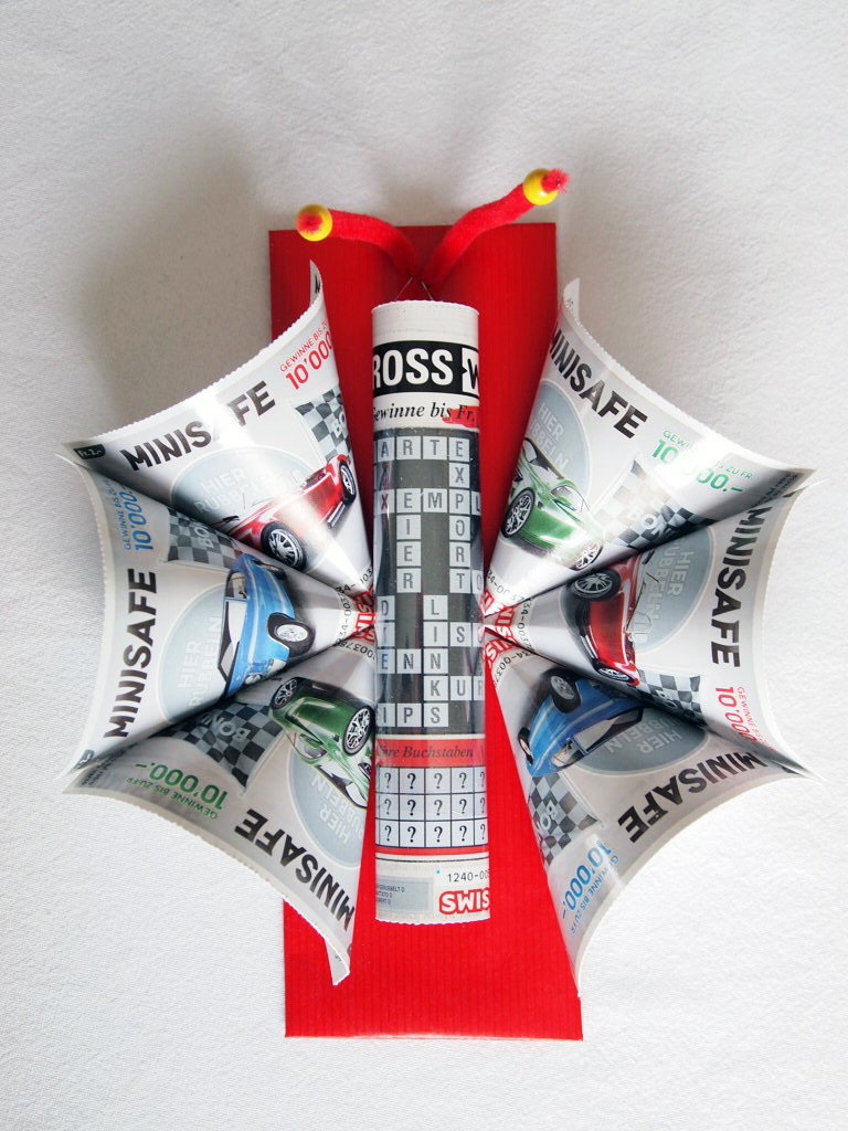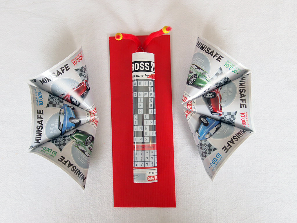 Für den Körper können Sie das Crossword-Los rollen und mit Cellophan einfassen. Das Cellophan können Sie einfach mit einem Klebestreifen zusammenkleben. (Es muss nicht das ganze Los eingefasst werden. Das Celophan dient dazu, dass kein Klebestreifen auf das Los angebracht werden muss und die Rubbelschicht nicht beschädigt wird).
