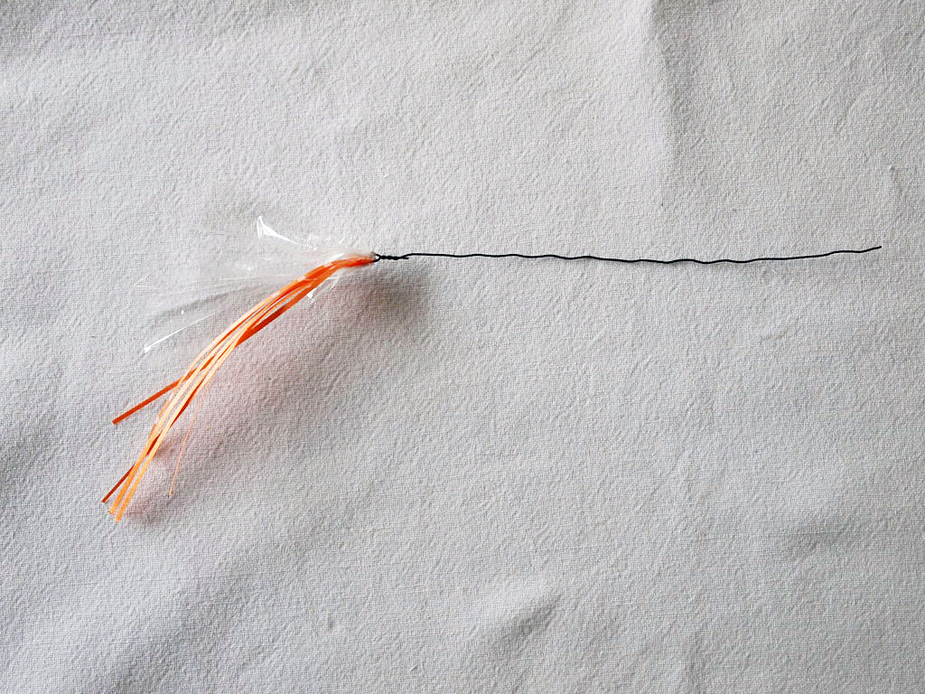 Bereiten Sie als erstes 7 Dekorationselemente aus den Geschenkbändeli und dem Cellophan vor. Dazu legen Sie ein schmales Stück Cellophan und ein Stück Geschenkband in die Mitte eines 40 cm langen Drahtes. Legen Sie nun den Draht in der Mitte zusammen und verdrehen Sie die beiden Drahthälften miteinander. So werden Geschenkbändeli und Cellophan automatisch befestigt. Die Geschenkbändeli können Sie auch noch in schmalere Stücke schneiden, damit es nach mehr aussieht.