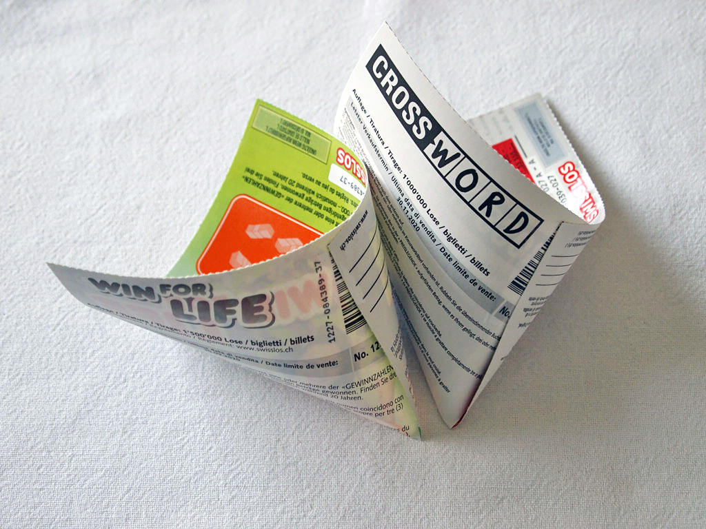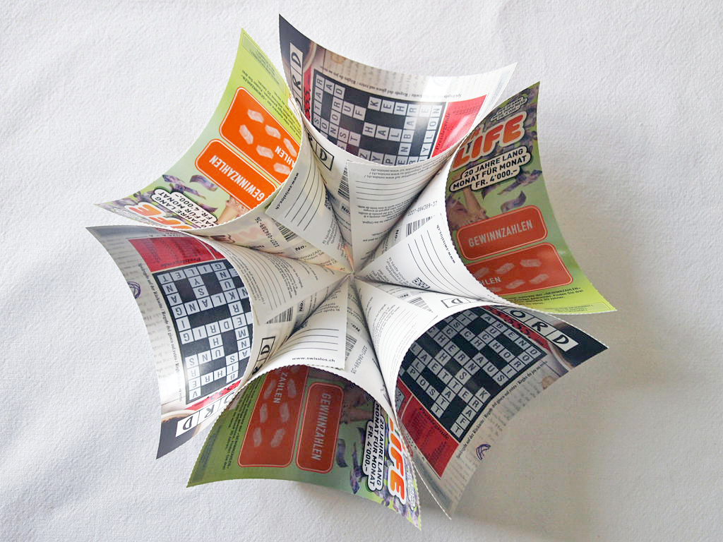 Markieren Sie nun bei den Losen jeweils die Mitte der langen Seiten mit einem Knick. Falten Sie anschliessend die Lose zu einem Trichter (Losrückseite ist aussen, die Markierung zeigt, wo die Spitze des Trichters ist). Damit die Lose in der Trichterform bleiben können Sie die überlappenden Enden auf der Aussenseite mit Klebestreifen zusammenkleben. Machen Sie dies mit allen 6 Losen.