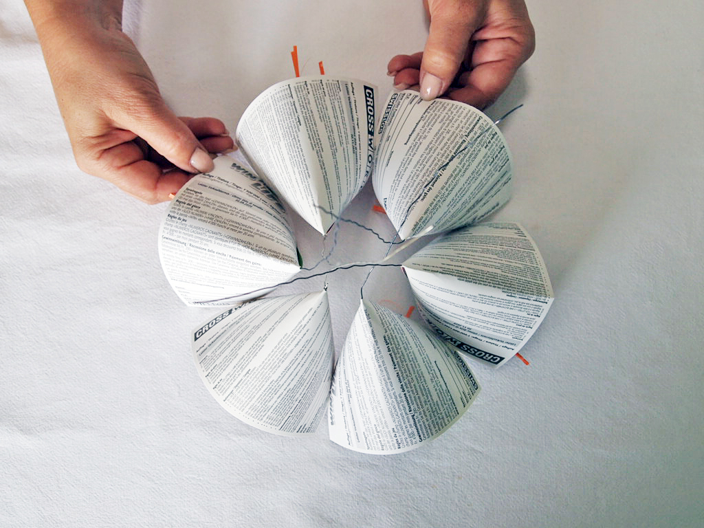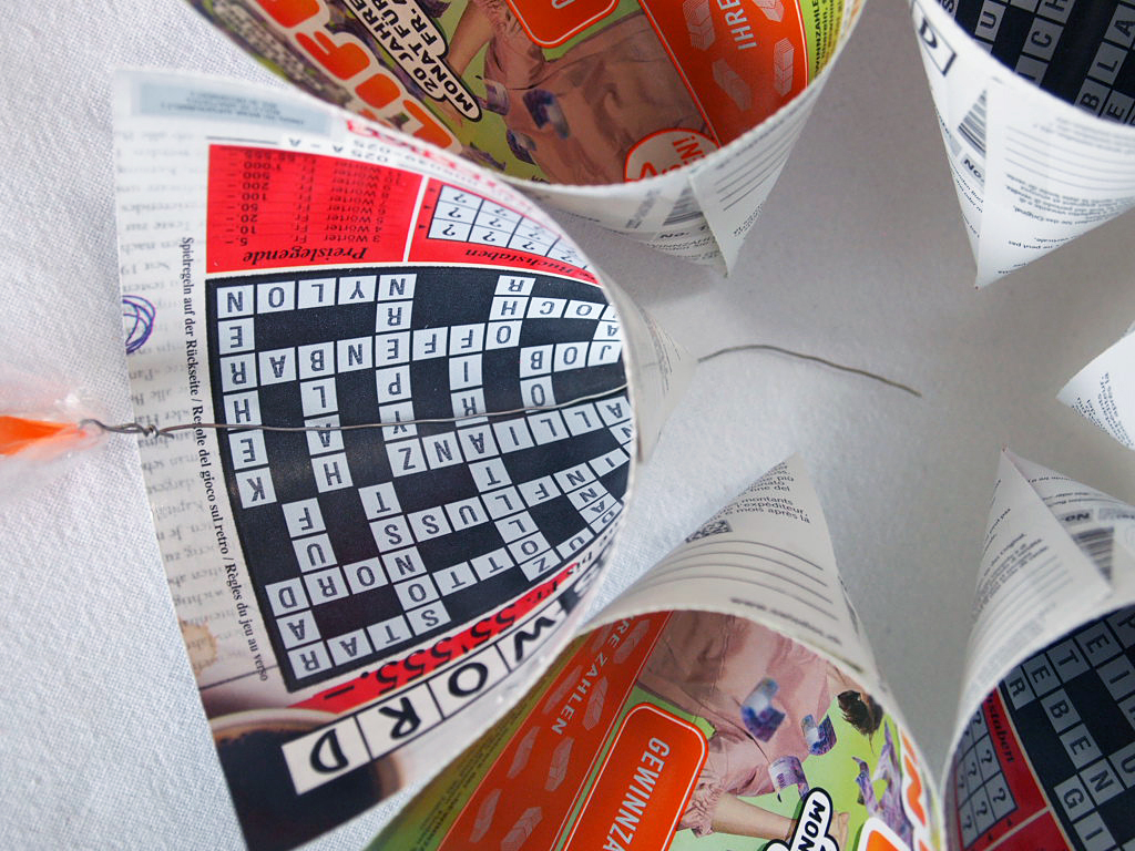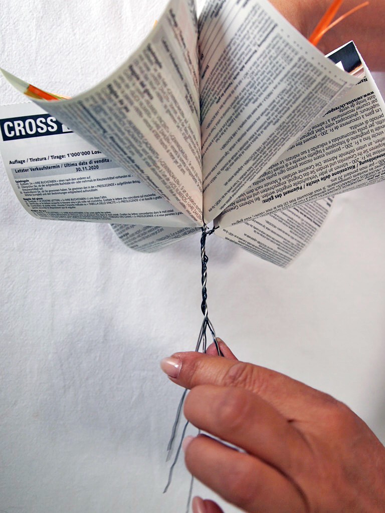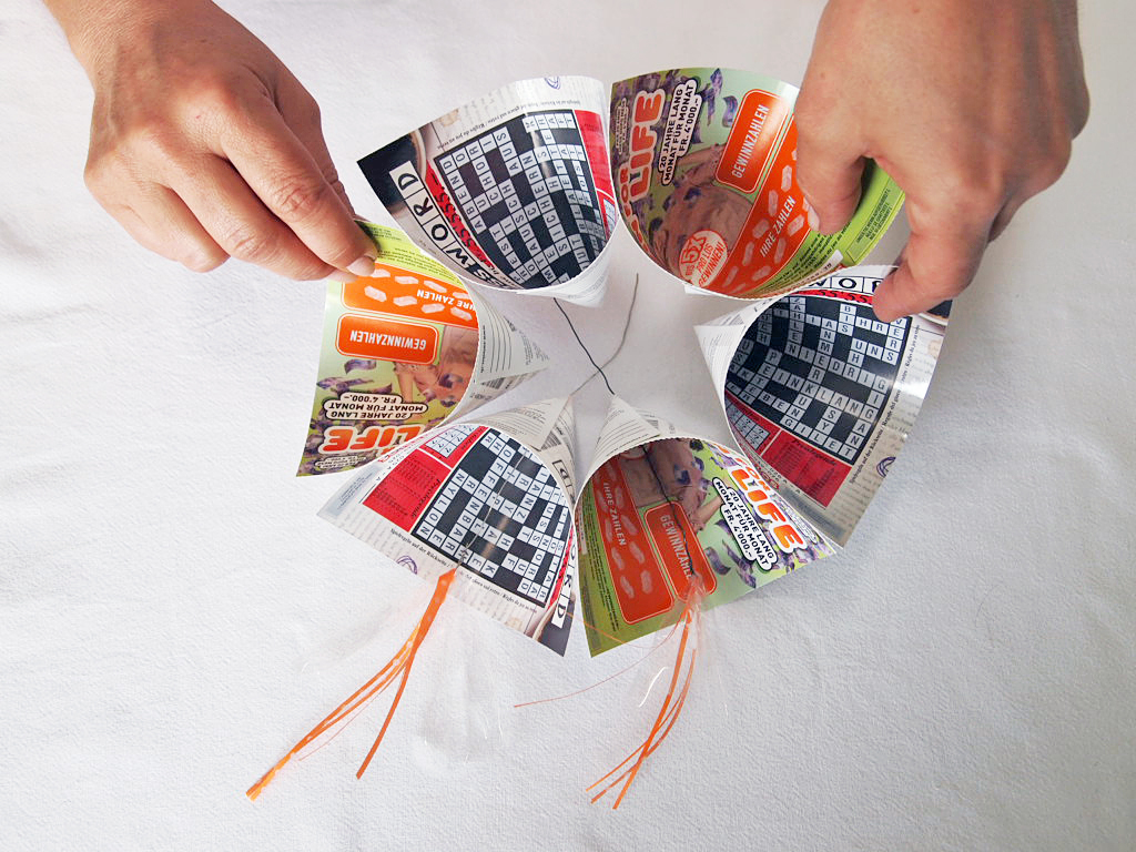 Nun können Sie bei jedem gefalteten Los eines der übrigen Dekorelemente durch die Mitten stecken.