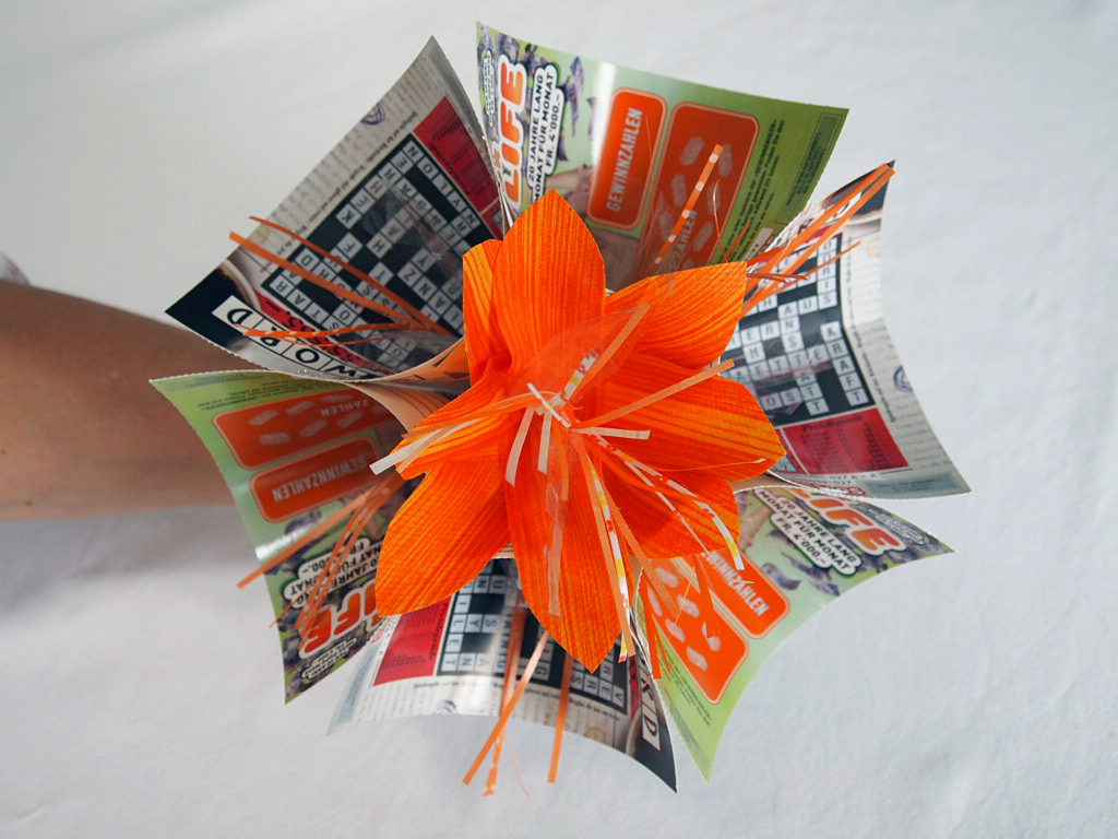 Stecken Sie jetzt die vorbereitete Blume in die Mitte der angeordneten Lose und verdrehen Sie alle Drähte auf der Rückseite miteinander. Somit sind die Lose und die Blüte miteinander verbunden und halten stabil zusammen.