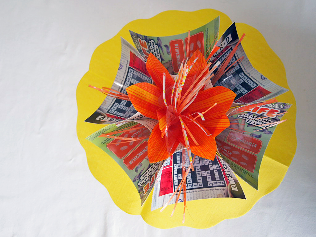 Mit einem der in Schritt 1 vorbereiteten Dekorationselemente können Sie die Blüte des Losstrausses machen. Schneiden Sie dazu eine der beiden Servietten in 4 gleich lange Stücke und runden Sie die kurzen Seiten so ab, dass die wie ein Blütenblatt aussehen. Anschliessend können Sie den Draht des Dekorationselementes durch die Mitten der Servietten stechen und die einzelnen Blütenblätter anordnen.
