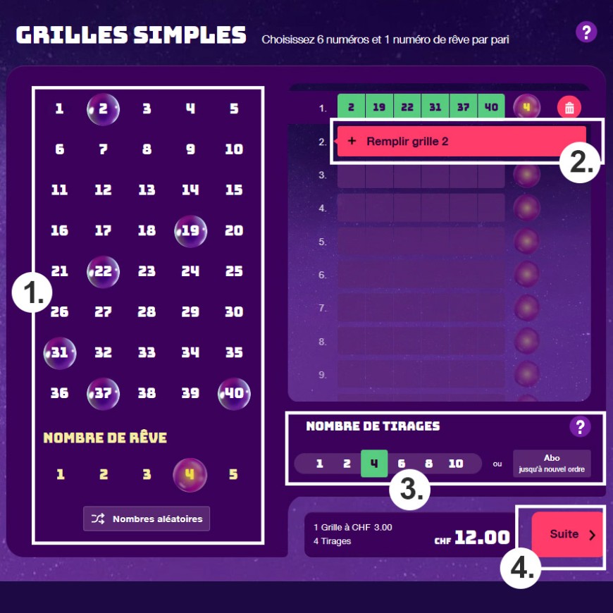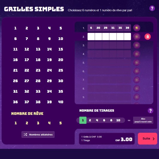 Vous cochez vous-même vos numéros et numéro de rêve dans chacune des grilles. Une grille coûte 3 francs. Il est possible de sélectionner de 1 à 15 grilles.