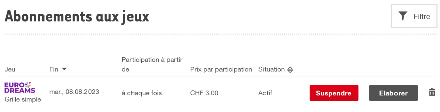 Via le lien „Abonnements aux jeux“ de votre compte, vous accédez directement au récapitulatif des abonnements. Vous pourrez modifier, supprimer ou relancer les abonnements.